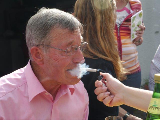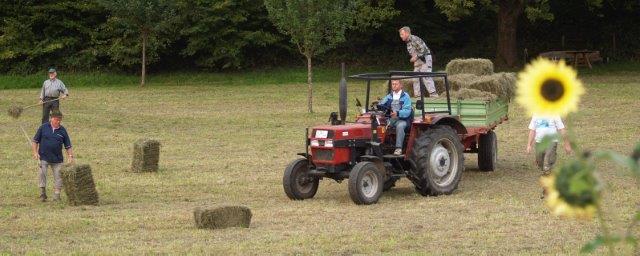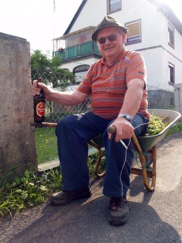 Mit Rudi Salz (+ April 20) habe ich zehn Jahre lang etliche herrliche Stunden in seinem Garten verbracht. Dort hatte er mir ein Stück abgetreten. Ich habe zwar rund um mein Haus einen großen Garten, aber das ist natürlich nicht halb so attraktiv, wie mit einem alten Gartenfuchs gemeinsame Sache zu machen. Rudi wusste im Garten genau, was er tat und kombinierte das mit dieser fantastischen Gemütlichkeit, die sich durch nichts auf der Welt drängen lasse. So achtete Rudi akribisch auf die Signale seines Körpers, der riet ihm gelegentlich zu einer kleinen Pause. Rudi hatte die Schubkarre immer griffbereit. Die ganze Bückerei lässt sich mit einem Fläschchen Bier gleich viel besser an. Hurra, wir machen Heu Das nächste Bild wurde mir jahrelang statt Fernsehen ins Wohnzimmer geliefert. Wenn bei Christoph Nacken das Gras erntereif war, hatte ich Ausblick auf dieses herrliche Premium-Programm. Alfred Neukirchen, Rudi Salz, Bohnen-Hans und Henni kommen Christoph zur Hilfe. Leider ersetzt mittlerweile ein starker Mäher die Herren, deren Einsatz immer in einer lustigen Runde unter einer Eiche endete.