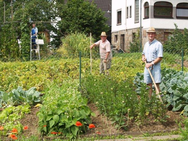 Wie fruchtbar Männer-Meditationen sein können, verrät ein Blick in die Nachbargärten. Über den Gartenzaun korrespondiert Henni auf der Leiter bei der Stangenbohnenernte mit Bruder Rudi (+ April 20) in den Kartoffeln und mit Hermann Engel (+ 2017) über die Neuigkeiten aus dem Gemüsebeet. Sie sind Meister in der Herstellung vom „Schwarzes Gold“, den ihre Komposthaufen in Hülle und Fülle hergeben. Ich habe meinen Garten daneben und habe mich in punkto Hutmode von der Warengenossenschaft den Herren angepasst.