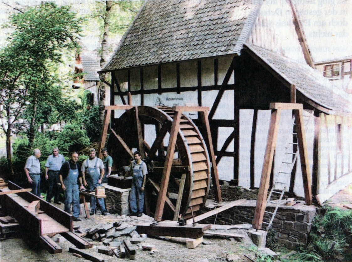 Windeck – Auf halber Strecke zwischen Heimatmuseum und Windecker Burgruine wird in einer historischen Scheune eine Mehlmühle rekonstruiert. Dort soll schon in den nächsten Tagen ein Mühlrad romantisch klappern, das mit Wasser aus dem Dorfteich angetrieben wird. Am Gemeinschaftsprojekt in dem Dorf, das zu den schönsten im Kreis zählt und das bereits mit Goldmedaillen ausgezeichnet wurde, wirkten neben dem Förderverein des Heimatmuseums die Gemeinde und der Wasserverband des Kreises mit. Außerdem gibt es Zuschüsse vom Amt für Agrarordnung in Höhe von 33.000 Euro, die Gesamtkosten werden über 70.000 Euro betragen. Die Wassermühle hat auch geschichtliche Bezüge. Museumsleiter Bruno Althoff fand heraus, dass wenige Meter neben dem auserkorenen Standort früher bereits eine Mühle existiert haben muss, die mit Wasser aus einem Weiher neben Althoffs Haus angetrieben wurde.