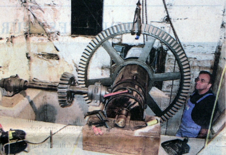 Zwar wird das vier Meter hohe und 2,6 Tonnen schwere Mühlrad von einer Fachfirma aus Mulda bei Dresden aus neuem Lärchenholz gebaut. Die Eisenteile an den Scheiben, das Kammrad und ein kleines Kegelrad stammen jedoch aus der Irsermühle von Müllermeister Aloys Schneider. „Damit haben meine Eltern damals gearbeitet“, bestätigt der Experte von der Deutschen Mühlen-Gesellschaft, der das Altwindecker Projekt ehrenamtlich mit betreut. Die alten Teile wurden in Mulda aufgearbeitet und dann vor Ort in Altwindeck eingebaut. Die Mühlenbauer aus Sachsen verfügen über eine große Erfahrung. Die Firma Schumann wird schon seit mehr als 120 Jahren in der vierten Familien-Generation geführt.