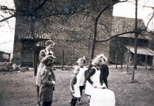 v. l. Gertrud Ottersbach sowie Helga, eine Cousine von Helmine Zimmermann (verh. Hahn); der Junge ist Karl Heinz Walgenbach, dahinter Christel Holschbach, am Puppenwagen Helmine Zimmermann, dahinter Käthe Ottersbach.