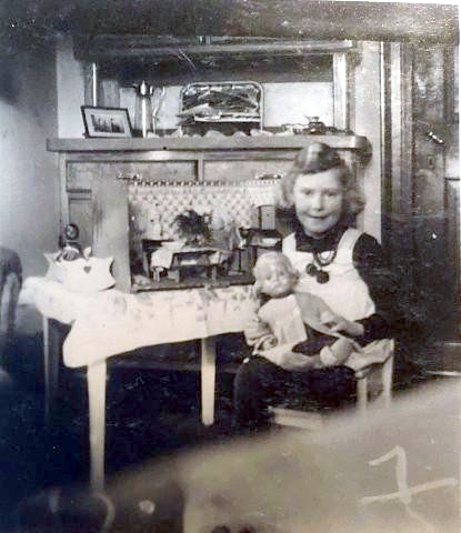 Dieses Foto entstand etwa 1940 im Haus „Burgwiese“, wo die Familie Ottersbach bis 1950 gewohnt hat. Die Puppe wurde in jedem Jahr zu Weihnachten neu eingekleidet. Der Kindertisch sowie der Kinderstuhl befinden sich heute noch im Familienbesitz.