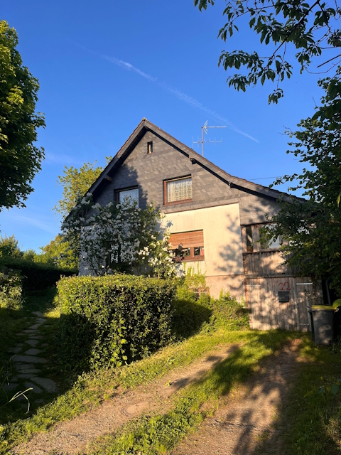 Das Bild zeigt die alte Giebelansicht des Nachbarhauses Schmeiss/ Fuchs/ heute Käthe Brokop. In grauer Vorzeit war es vermutlich Scheune oder Stall zum Wohnhaus des Vorbesitzers von „Im Thal Windeck 27“, Gerhard Hundhausen. Man beachte die vorgesehenen Fenster in der Giebelwand und das Plumpsklo. Auf dieses Klo gingen in dieser Zeit, etwa 1943, bis zu vier Wohnparteien.