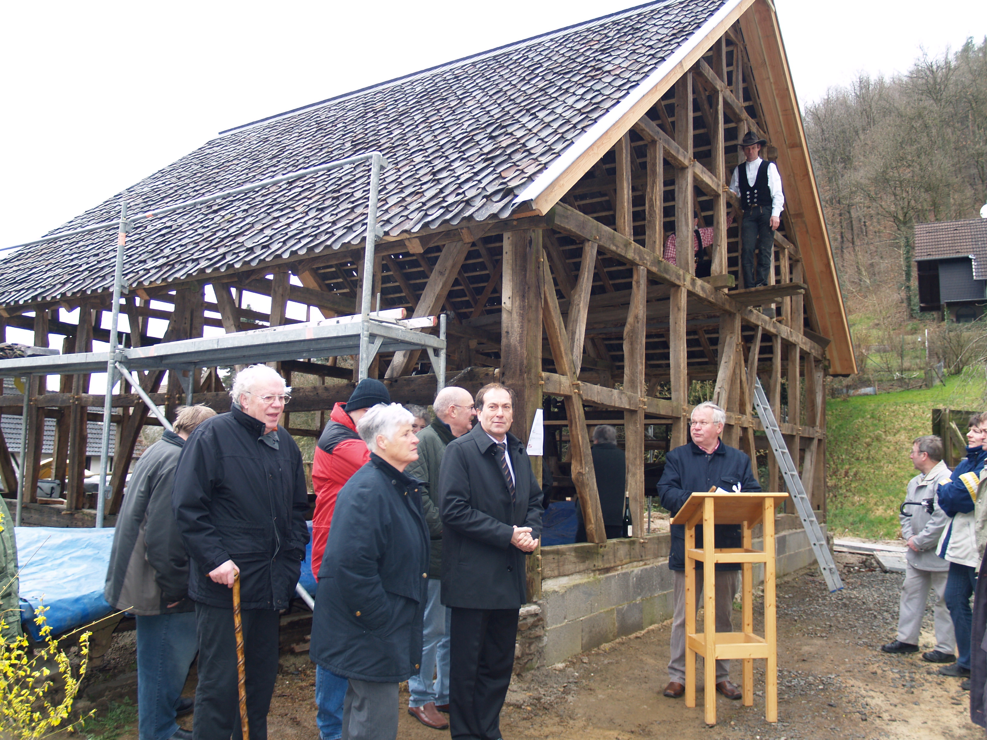 Windeck – Eiskalt pfeifen die letzten Ausläufer von Sturmtief „Emma“ beim Richtfest von Gutmühle, dem vorerst letzten Gebäude im Fachwerkensemble am Heimatmuseum in Altwindeck.