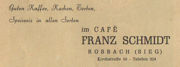 Werbeanzeige Café Franz Schmidt, 1953 Zeitungsartikel | Betriebe | 25.07.1953 Quelle: Festschrift zum 40-jährigen Bestehen des Turn- und Spielvereins 1913 Schladern (Sieg), 1953 Kirchstraße 10 Zurück Weiter