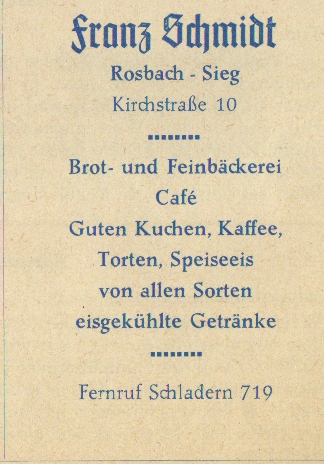 Werbeanzeige Café Franz Schmidt, 1959 Zeitungsartikel | Betriebe, Gaststätten | 04.07.1959 Quelle: 140-jähriges Traditionsfest mit Gesangwettstreit M.-G.-V. „Sängerbund-Concordia Rosbach (Sieg), 1959 Kirchstraße 10 Zurück Weiter