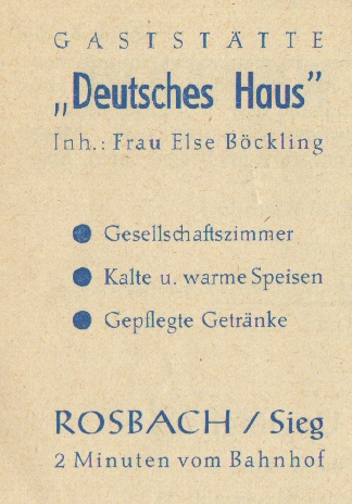 Werbeanzeige Deutsches Haus, 1959 Zeitungsartikel | Betriebe, Gaststätten | 04.07.1959 Quelle: 140-jähriges Traditionsfest mit Gesangwettstreit M.-G.-V. „Sängerbund-Concordia Rosbach (Sieg), 1959 Rathausstraße 9 Zurück Weiter