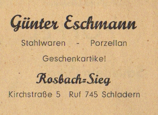 Werbeanzeige Günter Eschmann, 1958 Zeitungsartikel | Betriebe | 12.07.1958 Quelle: Festschrift zum 80. Stiftungsfest des Männergesangvereins Öttershagen bei Rosbach Sieg am 12., 13., und 14. Juli 1958 Kirchstraße 5 Zurück Weiter