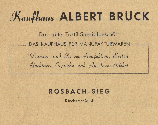 Werbeanzeige Kaufhaus Albert Brück, 1953 Zeitungsartikel | Betriebe | 25.07.1953 Quelle: Festschrift zum 40-jährigen Bestehen des Turn- und Spielvereins 1913 Schladern (Sieg), 1953 Kirchstraße 4 Zurück Weiter