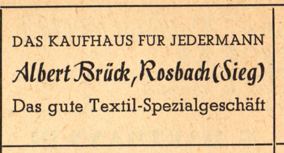 Werbeanzeige Kaufhaus Brück 1951 Zeitungsartikel | Betriebe | 01.01.1951 Quelle: Gemeindebuch der Kreissynode an der Agger, 1951 Rathausstraße 15 Zurück Weiter