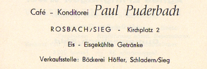 Werbeanzeige Konditorei Paul Puderbach, 1963 Zeitungsartikel | Betriebe | 03.08.1963 Quelle: 50 Jahre Turn- und Spielverein Schladern/Sieg, 1963 Kirchplatz 2 Zurück Weiter