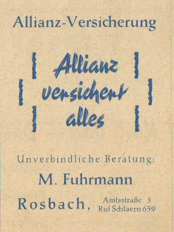 Werbeanzeige M. Fuhrmann, 1959 Zeitungsartikel | Betriebe | 04.07.1959 Quelle: 140-jähriges Traditionsfest mit Gesangwettstreit M.-G.-V. „Sängerbund-Concordia Rosbach (Sieg), 1959 Amtsstraße 3 Zurück Weiter