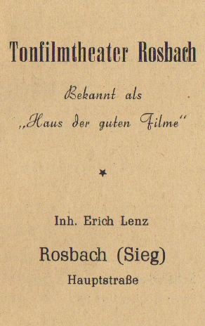 Werbeanzeige Tonfilmtheater Rosbach, 1953 Zeitungsartikel | Betriebe | 25.07.1953 Quelle: Festschrift zum 40-jährigen Bestehen des Turn- und Spielvereins 1913 Schladern (Sieg), 1953 Rathausstraße 9 Zurück Weiter