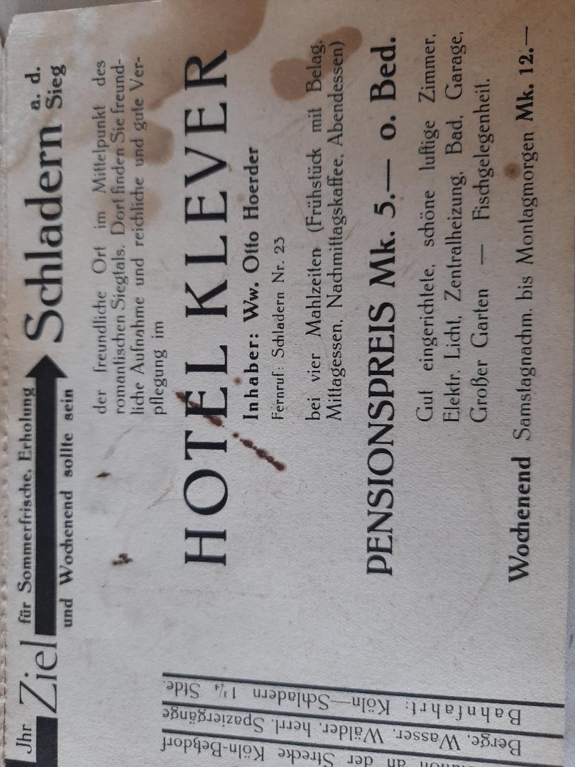 Am Bahnhof in Schladern stand das Hotel Clever. Es hatte bereits mehrfach den Besitzer gewechselt, gehörte der Bielsteiner Brauerei und stand 1938 zum Verkauf.