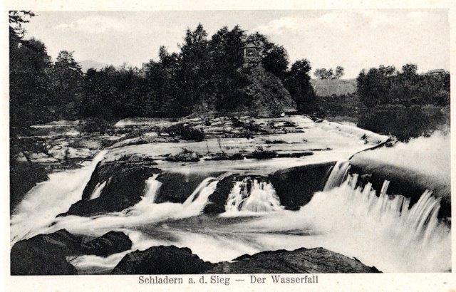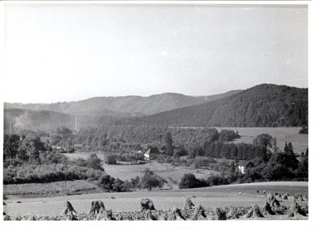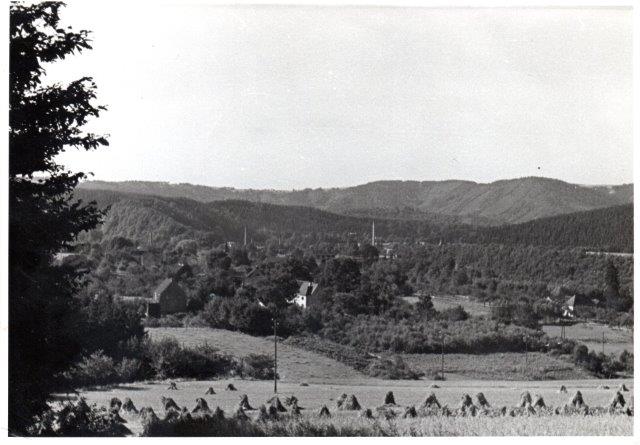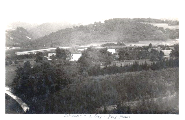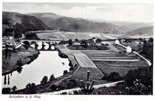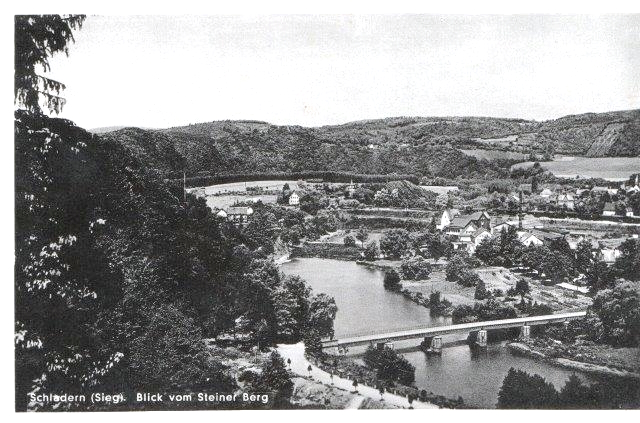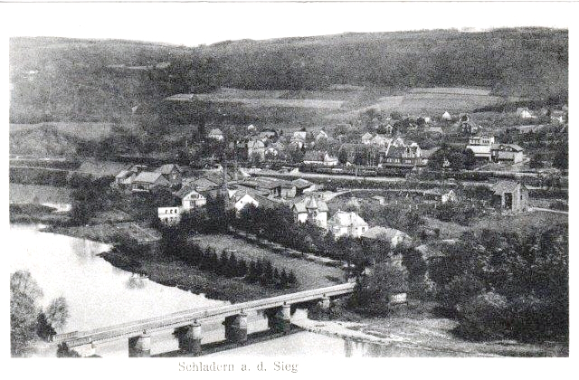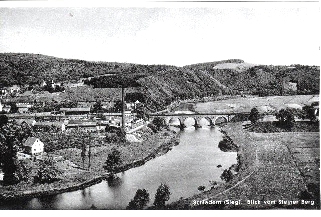 Schladern mit dem Turm der Firma Langen, der in den 60er Jahren gesprengt wurde, rechts Blick auf Mauel. Das große Haus vor den Schienen ist heute abgerissen, dort wohnten die Geschwister Kammerich.