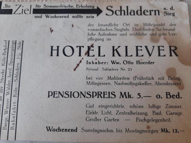 In Schladern am Bahnhof gab es das Hotel Clever. Es hatte öfter den Besitzer gewechselt, gehörte der Bielsteiner Brauerei und stand 1938/1939 zum Verkauf.